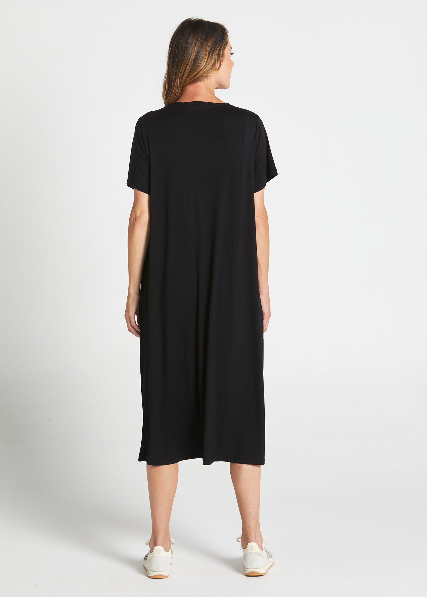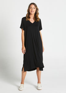 A classic transeasonal piece, the Irena Bamboo Dress features a sleek V-neckline and short sleeves in a relaxed fit, crafted from silky stretch viscose bamboo jersey. Its straight hemline and refined fabric lend a polished, chic aesthetic ideal for effortless sophistication across seasons.
