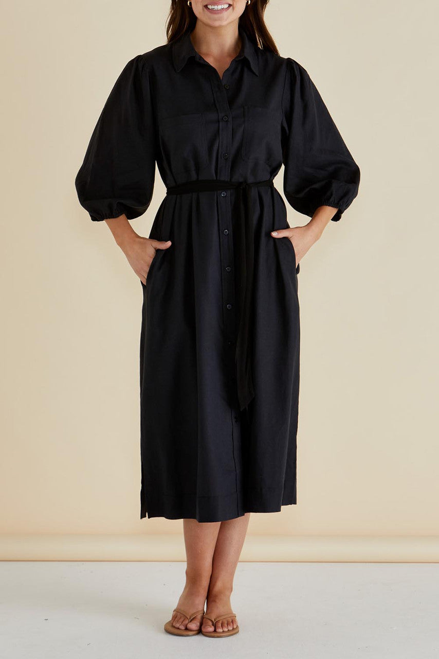 The Angelina Dress is a refined choice for the modern woman, crafted in a viscose blend that feels soft and comfortable. Its billowing sleeves and detachable waist tie create an elevated, classic silhouette. The button-up front and relaxed fit make it an effortless transeasonal staple that exudes sophistication and ease.